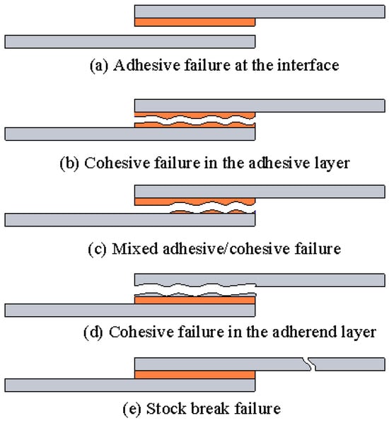 Common types of bonding failure, including (a) adhesive failure at the interface, (b) cohesive failure in the adhesive layer, (c) mixed adhesive/cohesive failure, (d) cohesive failure in the adherend layer, and (e) stock-break failure.