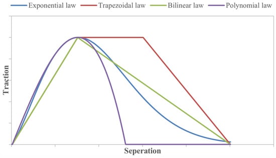 Common traction–separation laws used for CZM, including bilinear, exponential, trapezoidal, and polynomial laws.