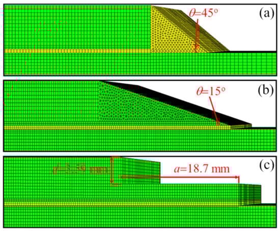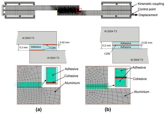 A key advantage of CZM is that it does not require a priori knowledge of the crack path; the crack can initiate and propagate wherever the damage criteria are met. This is especially useful for complex joints where the failure path may not be obvious (e.g., in dissimilar adherend joints where one might develop asymmetric cracks). Sugiman et al. [45] studied the position of the CZM within the adhesive layer, as shown in Figure 8, and reported that whether centered or placed at the interface, it did not affect the predicted strength. However, based on their experimental observation of cohesive failure occurring within the adhesive, they chose to place the CZM within the adhesive layer rather than at the interfaces. Hartlen et al. [46] evaluated different cohesive element formulations within LS-DYNA for CZM of adhesively bonded interfaces, emphasizing that the choice of element type should align with the modeled adherend geometry and expected stress states. Mottaghian and Taheri [47] explored different finite element modeling strategies for the adhesive layers in a double-strap joint, as illustrated in Figure 9. It combines varying numbers of zero-thickness and non-zero-thickness cohesive elements with continuum elements. Configurations range from simple single-element models to more refined multi-element representations. They found that using multiple zero-thickness cohesive element layers provided the most accurate prediction of damage evolution in the joint. In fact, a configuration with five layers of these interface elements through the thickness gave the best results, capturing the progressive failure of the adhesive. Their study also considered geometric effects: increasing the strap length and thickness improved joint capacity, but only up to a point. Beyond a certain strap size, the joint strength could not be improved further, indicating that the load transfer had been maximized.