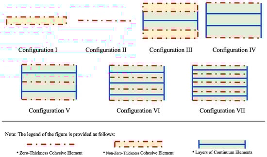 FE configurations for the adhesive layer modeling. Configurations I–VII represent different combinations of cohesive and continuum elements. Red dashed lines indicate zero-thickness cohesive elements; red blocks indicate non-zero-thickness cohesive elements, and blue blocks represent continuum elements [47].