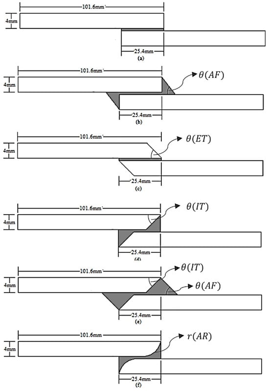- Ejaz, H.; Khan, H.; Mazhar, F.; Haq, I.U. An experimental and simulation study of various geometric modifications effects in single lap joint. Forces Mech. 2022, 9, 100144. [Google Scholar] [CrossRef]