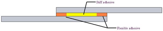 In a bi-adhesive bonded joint, two adhesives with different properties are applied along a single overlap to optimize performance. Typically, a tough and compliant adhesive is used near the ends of the overlap, while a stiffer and higher-strength adhesive occupies the middle section, as shown in Figure 12. This configuration allows the stiff adhesive to carry the main shear load in the low-deformation region, whereas the flexible adhesive accommodates the larger peel and shear strains at the lap ends. This spatial tailoring helps achieve a more uniform stress distribution and a delay in failure onset. Özer and Öz [71] performed numerical and analytical analyses of bi-adhesive double lap joints and demonstrated that a well-chosen bond length ratio can, indeed, reduce peak stresses. Ramezani et al. [72] showed that a proper stiff–ductile adhesive pairing can significantly increase failure load by fostering a more uniform stress distribution along the overlap, validating the concept with DIC measurements. Fracture is generally observed to initiate at the transition zone between the stiff and compliant adhesives, with crack propagation occurring predominantly through the brittle adhesive layer. Nonetheless, after joint failure, the adherends remain partially bonded by the flexible adhesive. Jairaja and Naik [73] showed that in dissimilar adherend SLJs, a dual-adhesive bondline achieved higher strength than a single-adhesive bond due to improved stress distribution. Akhavan-Safar et al. [74] conducted a comprehensive review on the benefits and manufacturing challenges of using bi-adhesives. They emphasized that, while bi-adhesive joints can significantly enhance strength and reduce weight compared to single-adhesive joints, careful selection of a compatible ductile–stiff adhesive pair and appropriate joint geometry is crucial for optimal performance.