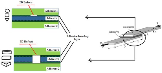 - Heidarpour, F.; Farahani, M.; Ghabezi, P. Experimental investigation of the effects of adhesive defects on the single lap joint strength. Int. J. Adhes. Adhes. 2018, 80, 128–132. [Google Scholar] [CrossRef]