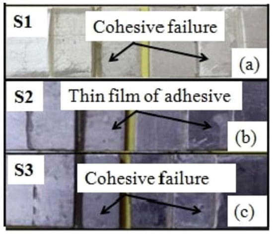Failure modes in SLJs can be cohesive (through the adhesive), interfacial (adhesive-substrate debonding), or in the adherend (e.g., delamination in composites or yielding in ductile metals). Often, a combination occurs. Stuparu et al. [9] examined both similar and dissimilar material SLJs. Dissimilar joints composed of aluminum and carbon fiber adherends showed lower strength, primarily due to delamination in the composite adherend induced by peel stresses. Standard simulations, which overlooked internal composite damage, tended to over-predict strength due to an incomplete representation of delamination. To enhance accuracy, they recommended using refined laminate modeling techniques. In a related study, Taib et al. [16] performed finite element analysis of single and joggled lap joints with composite adherends, revealing how geometric discontinuities like joggles can redistribute stress and mitigate critical peel zones, thereby improving joint durability. Kupski et al. [17] demonstrated that the ply layup sequence in a composite adherend strongly influences the failure mechanism: with a 0° fiber layer at the bond interface, failure was more likely within the adhesive (cohesive failure) because the adherend could carry load well, whereas a 90° surface ply (fibers perpendicular to load) made the interface weaker and led to composite adherend failure. Their study further concluded that increasing the bending stiffness of the adherend enhances the joint’s tensile strength by delaying damage initiation. However, achieving higher ultimate load capacities requires a stacking sequence that promotes crack propagation within the composite adherend. As another example, Luo et al. [18] observed that SLJs with thick, stiff adherends tended to fail cohesively in the adhesive, whereas joints with thinner, more flexible adherends often failed due to a mix of laminate peeling in the composite and fiber tearing. This occurs because flexible adherends bend more, increasing peel stress that can strip fibers from the composite surface. In the case of defective adhesives, a mixed failure mode was found to be dominant. Tang et al. [19] studied SLJs focusing on how bondline thickness affects failure modes. They observed that failure in thick adherend joints typically initiated at the adherend adhesive interface, followed by interlaminar (delamination) failure in the composite adherend’s first ply near the interface. Interestingly, their experiments showed that reducing the bondline thickness increased joint strength. Thinner adhesive layers promoted stronger joints in their case, likely because the thicker adhesives introduced more compliance and greater peel stresses under load.