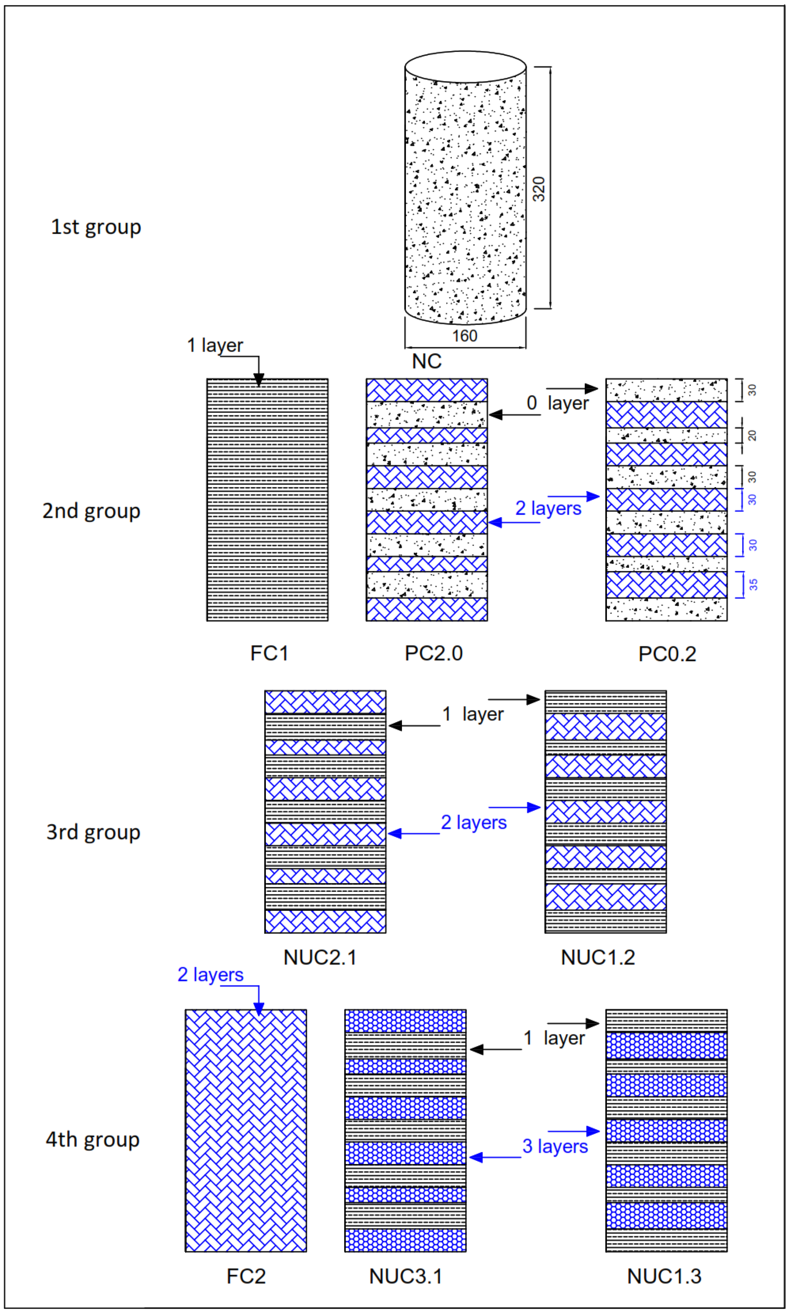41], selecting between full, partial, and non-uniform confinement strategies largely depends on structural requirements, access limitations, and budget constraints. Nevertheless, systematic comparative studies evaluating these confinement strategies are relatively scarce, creating a knowledge gap concerning the optimal usage of CFRP. This study addresses the gap by systematically evaluating the compressive behavior of concrete cylinders under full, partial, and non-uniform CFRP, using equivalent material quantities.