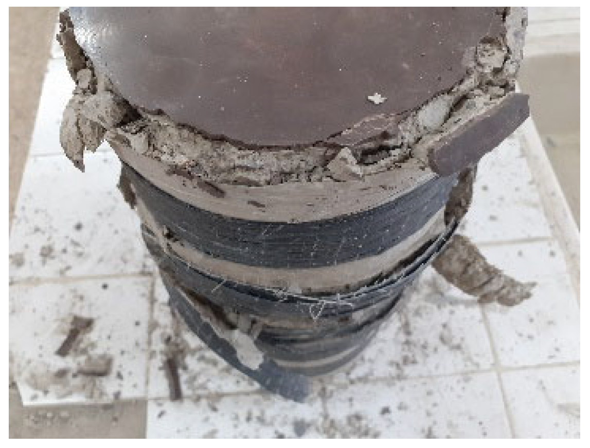 36], where CFRP-confined specimens exhibited premature jacket rupture due to inadequate strain compatibility between the concrete core and the external reinforcement. The anisotropic and brittle nature of CFRP materials further limits their capacity to undergo plastic deformation, resulting in a rupture that is predominantly elastic brittle in character. The observed failure morphology, as depicted in