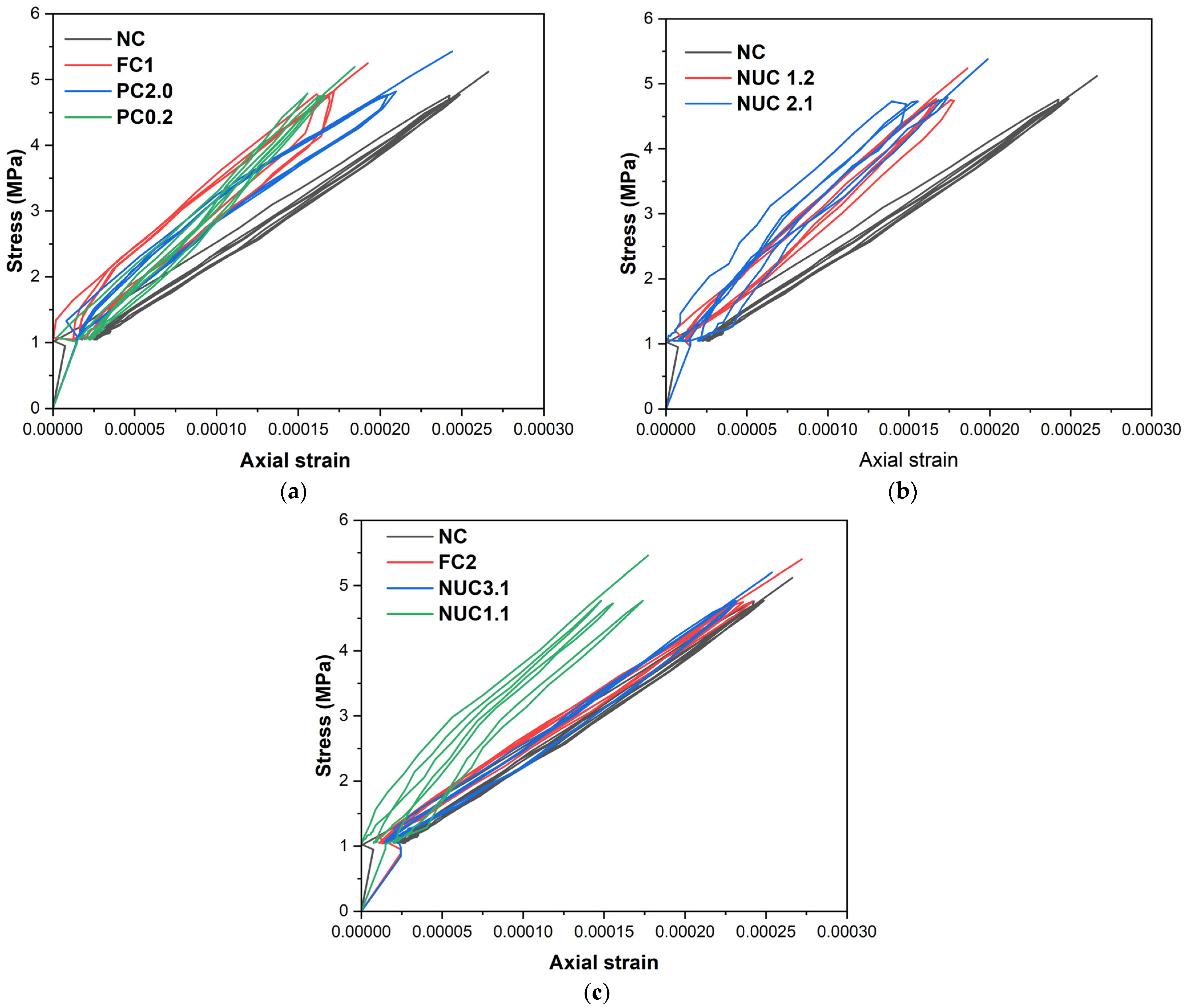 All specimens exhibited a consistent linear stress–strain response during initial cyclic loading up to 30% of peak load (
