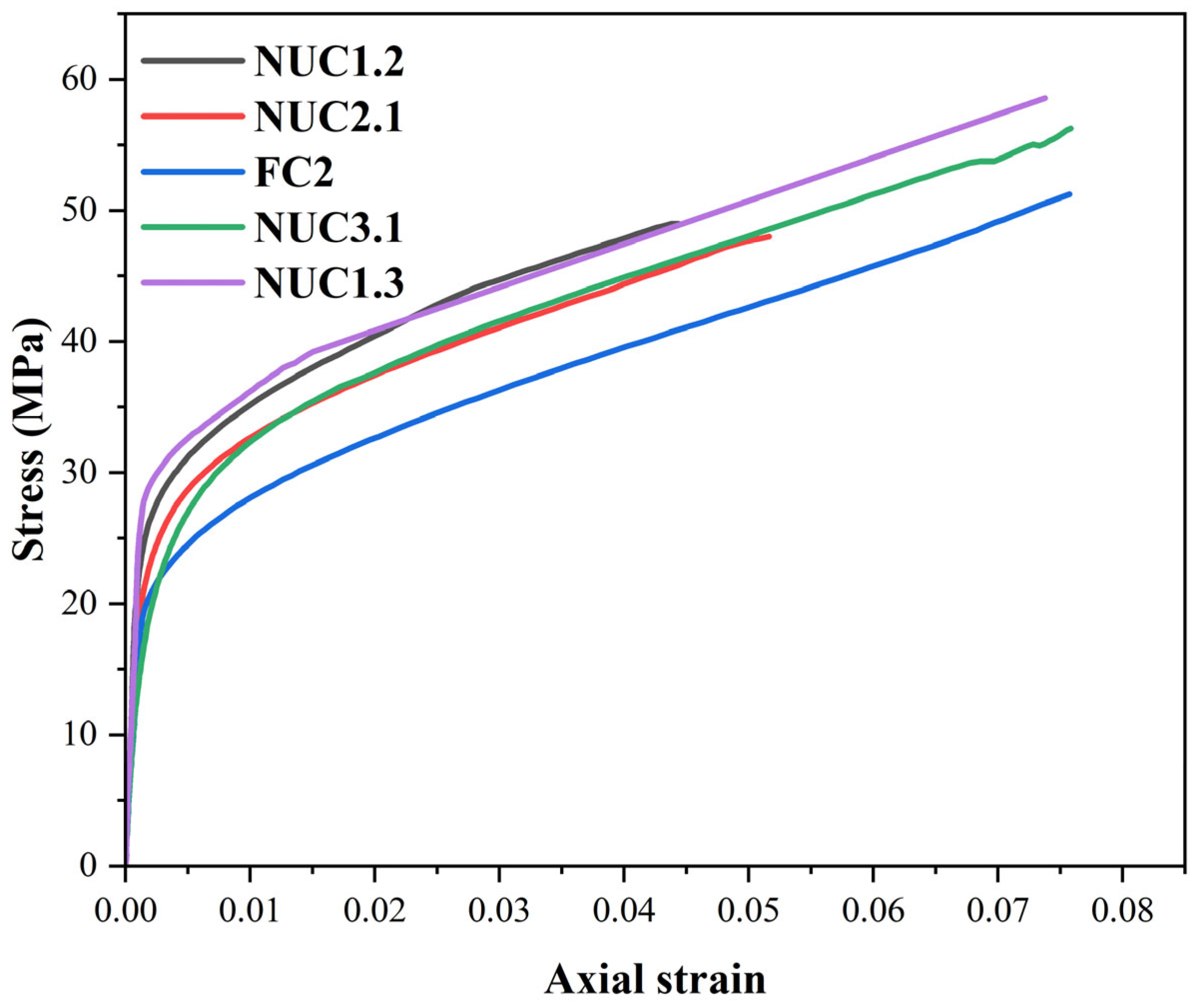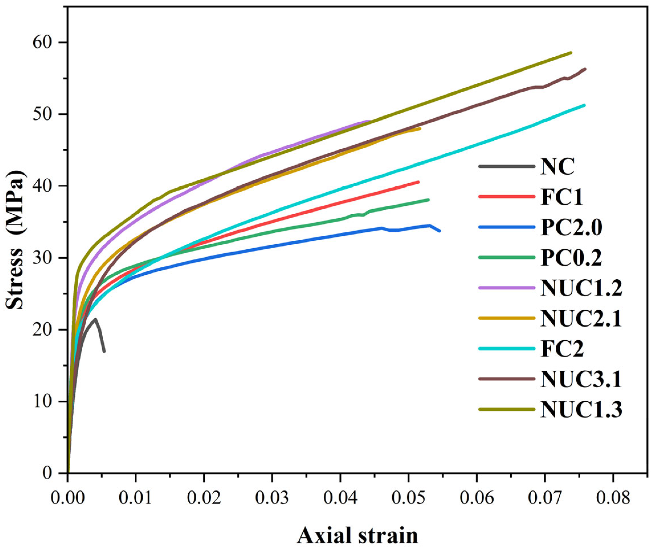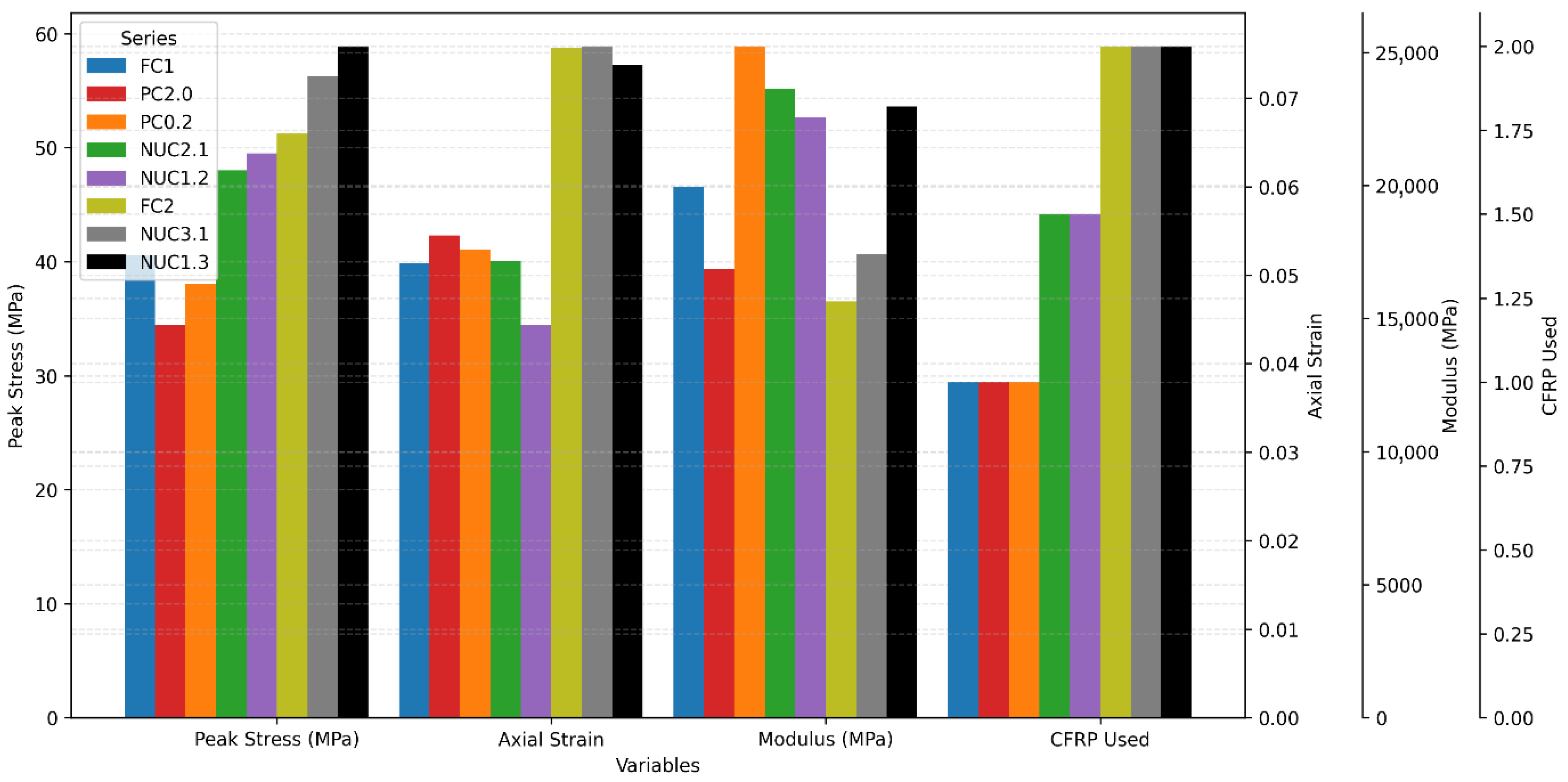 However, the coefficients of variation (COVs) for peak axial strain range from 1.66% to 5.17%, depending on the confinement configuration. Once again, the NUC3.1 and NUC1.3 series show the lowest COVs—1.66% and 2.10%, respectively—indicating excellent consistency in peak strain values, which can be attributed to the stabilizing effect of the external CFRP confinement. In contrast, the PC2.0 (5.17%) and FC2 (4.20%) series exhibit greater variability in axial strain, possibly due to localized stress concentrations or early debonding phenomena that introduce strain heterogeneity.