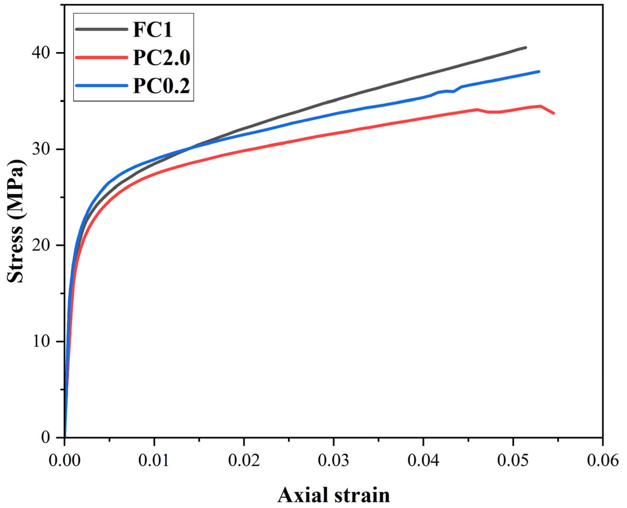 Table 5). However, the recorded deformations for PC2.0 and PC0.2 exceed those for FC1 by 6% and 3%, respectively. These trends confirm that full wrapping provides higher compressive strength, and the partial confinement enhances deformability [