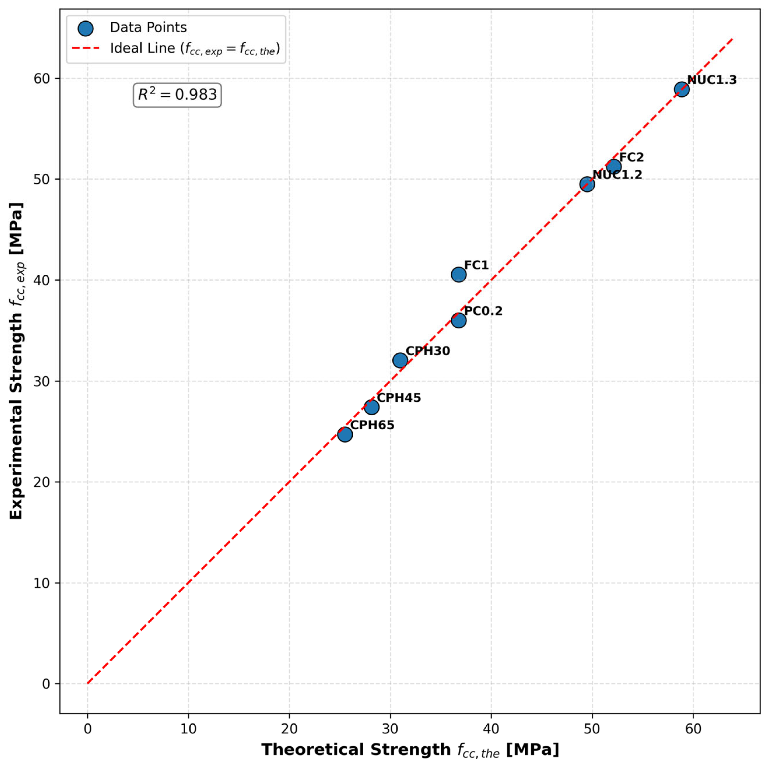 43]. However, it is important to recognize the inherent limitations of small-scale laboratory tests. These include idealized boundary conditions, uniform stress distribution, and perfect bonding assumptions that may not fully replicate field conditions such as load eccentricity, slenderness effects, or environmental degradation. Therefore, further research involving full-scale specimens, multi-axial loading scenarios, and long-term performance evaluations is necessary to bridge the gap between material characterization and reliable structural design.