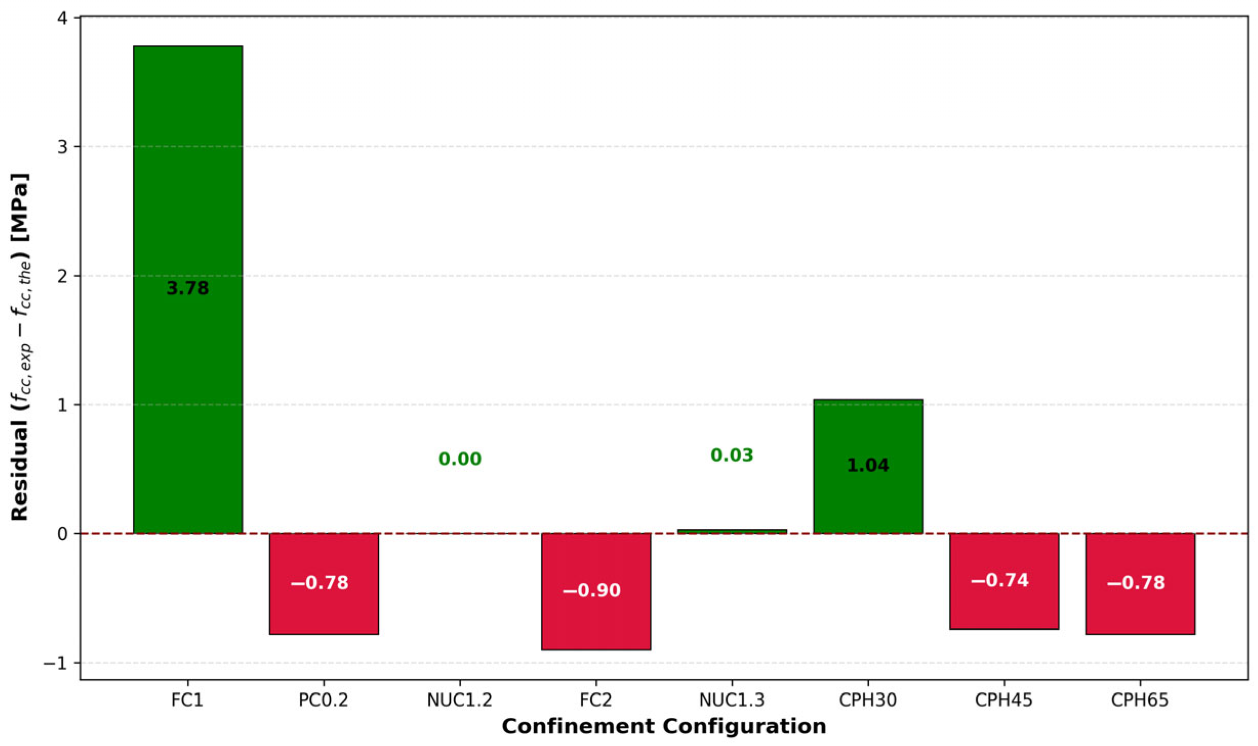 Overall, the close match between experimental and theoretical values, combined with the small and randomly distributed residuals, validates the effectiveness of the proposed model for estimating the confined concrete strength under varying confinement conditions.