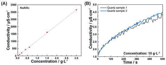 (A) Conductivities of solutions as a function of NaAlO2 concentrations and (B) temporal evolution of conductivity in quartz suspensions during early-stage dissolution.