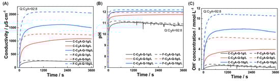 Figure 2 depicts the evolution of conductivity, pH and hydroxide ion concentration in C3A–quartz suspension during dissolution. As shown in Figure 2A, all suspensions exhibited a linear conductivity increase stage within the first tens of seconds, followed by a stabilization period. Higher mixture concentrations yielded greater conductivity values, while finer C3A accelerated conductivity growth rates at identical concentrations. The pH variation pattern (Figure 2B) paralleled conductivity trends. Hydroxide ion concentration profiles (Figure 2C) were further derived from pH values using their temperature-dependent correlation. Based on hydroxide ion concentration change rates during the 0–30 s linear phase, C3A’s specific surface areas, and the dissolution kinetics equation [38], the following equation was generated: