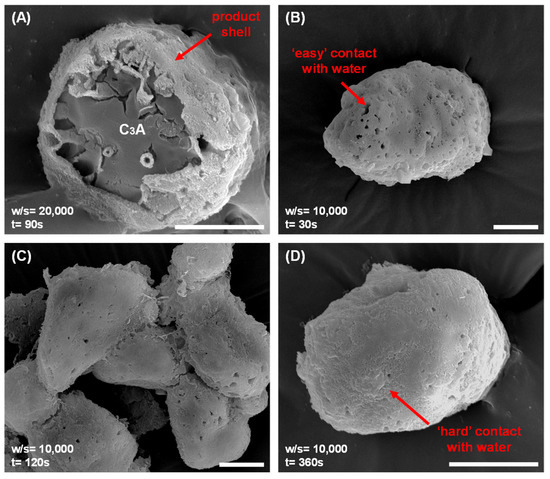 Morphological evolution during C3A’s dissolution provides critical insights into reaction-controlling mechanisms. To preserve the morphology of C3A at specific dissolution times in water, samples were rapidly frozen using liquid nitrogen and freeze-dried, as shown in Figure 3. Analysis of these preserved samples revealed that surface product layers formed very rapidly on the C3A particles. Critically, Figure 3A demonstrates that these layers were already present after just 90 s, even at a very high water-to-solid ratio (w/s = 20,000). Further, lower w/s ratios (such as 10,000, shown in Figure 3B–D) accelerated this layer formation. As the reaction time increased from 30 s to 3600 s at w/s = 10,000, the product layers became progressively denser. This densification indicates a reduction in the direct contact channels between unreacted C3A and the surrounding water. Combined with supporting conductivity and pH measurements, these morphological observations establish that the formation of these surface product layers is the primary reason for the significant decrease observed in C3A’s dissolution rates.