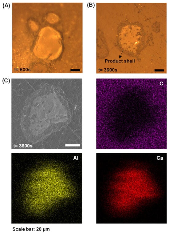 Furthermore, previous conductivity/pH measurements indicate C3A’s dissolution quickly entered a stage where conductivity/pH values were essentially constant. This phenomenon could be attributed to either the essentially stopped reaction of C3A or the establishment of dissolution–precipitation equilibrium [1]. As presented in Figure 4A,B, these optical micrographs reveal progressively thickening dark rims surrounding reacted C3A particles, with rim darkness intensifying over time. These rims represent product layers exhibiting lower optical reflectance than unhydrated C3A cores. SEM-EDX mapping (Figure 4C) corroborates this interpretation, showing significant depletion of aluminum and calcium at particle peripheries, definitive evidence of product layer formation.