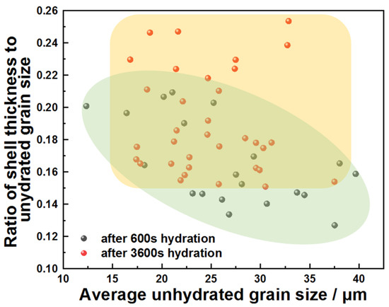 Growth kinetics of the product layer serve as a critical indicator for mechanism discrimination: continuous thickening during the stabilization stage confirmed dissolution–precipitation equilibrium, whereas a constant thickness indicated that the reaction had ceased. Figure 5 quantifies the thickness ratio of product layers to unreacted cores for different C3A particle sizes at 600 s and 3600 s, where higher ratios indicate greater reaction extent. The statistically distinct clustering of ratios (3600 s > 600 s) demonstrated progressive hydration between 600 s and 3600 s.
