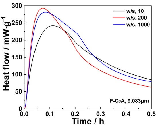 Isothermal calorimetry was employed to systematically evaluate the impact of w/s on the exothermic behavior of C3A’s hydration. As demonstrated in Figure 6, elevating w/s from 10 to 200 markedly accelerated early-stage hydration kinetics, which is commonly observed in cement chemistry [39]. This acceleration plateaued when w/s was further increased to 1000, exhibiting minimal reaction rate variation due to comparable solution saturation levels under these conditions. Consequently, calorimetric measurements beyond w/s = 1000 were precluded in this study by instrument capacity limitations.