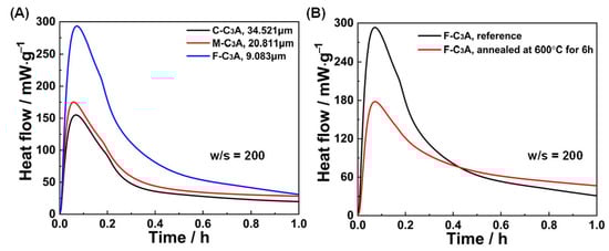 The reactivity of particulate systems usually decreases as particle size increases due to the increased specific surface area. This fundamental principle is validated in Figure 7A, where finer C3A particles exhibited accelerated hydration kinetics during the first hour, compared to coarser counterparts. Beyond particle size, atomic-scale defect density also emerged as a governing parameter for hydration kinetics [40]. Thermal annealing at 600 °C for 6 h (Figure 7B) progressively eliminated crystal defects in C3A, consequently suppressing heat release rates through reduced reaction site availability.