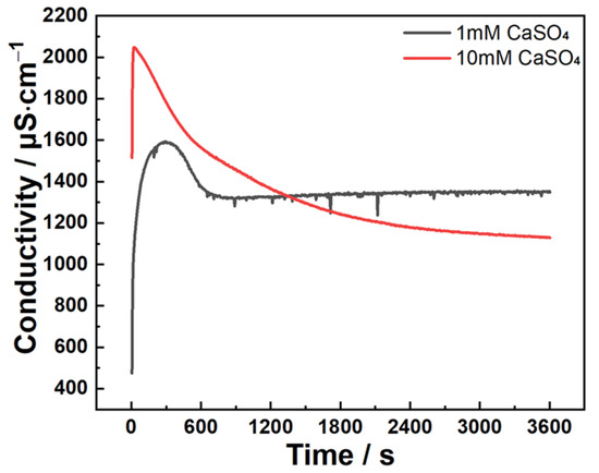 Figure 8 presents conductivity evolution profiles of C3A powder reacting in 1 mmol·L−1 and 10 mmol·L−1 CaSO4 solutions. Both curves exhibit an initial ascent to peak values followed by gradual decline. Notably, unlike the 10 mmol·L−1 system, conductivity in the 1 mmol·L−1 solution transitions to a plateau stage after approximately 810 s of descent.