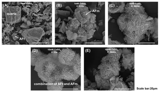 Morphologies of C3A–quartz mixtures after reacting in a 1 mmol·L−1 CaSO4 solution for (A) 290 s, (B) 810 s and (C) 3600 s, and after reacting in a 10 mmol·L−1 CaSO4 solution for (D) 25 s and (E) 3600 s.