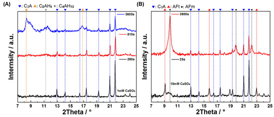 XRD patterns of C3A after reacting (A) in a 1 mmol·L−1 CaSO4 solution and (B) in a 10 mmol·L−1 CaSO4 solution for different times.