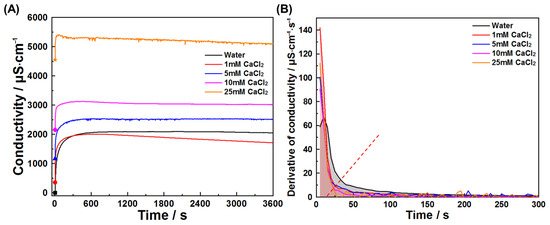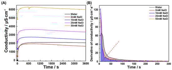 This study also investigated early hydration of C3A in chloride solutions and chloride–sulfate composite systems. Figure 11 and Figure 12 present conductivity profiles and their derivatives for C3A–quartz mixtures in CaCl2 and NaCl solutions, respectively. Figure 11A reveals similar curve shapes across all solutions, indicating consistent reaction pathways: initial rapid dissolution followed by product nucleation and growth. The pre-inflection conductivity increment decreases with rising CaCl2 concentration, signifying reduced reaction extent during product formation. This trend is further elucidated in Figure 11B, where increasing CaCl2 concentration progressively reduces derivative curve envelope areas and advances inflection points. Under the assumption that ion consumption by product growth negligibly interferes with dissolution during the initial 20 s, derivative values qualitatively reflect CaCl2’s influence on dissolution kinetics, where higher values denote faster dissolution. C3A’s dissolution was enhanced in all four CaCl2 concentrations tested, though not monotonically with concentration. Similar phenomena are observed for NaCl solutions (Figure 12).