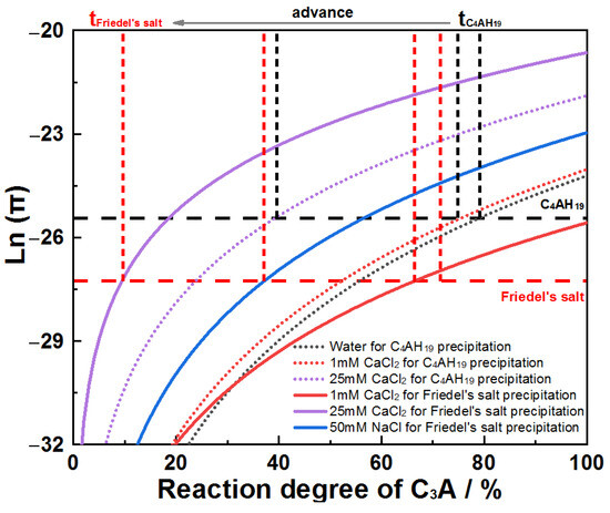 Evolution of Ln(π) as a function of C3A reaction degree when hydrating in CaSO4–NaCl solutions.