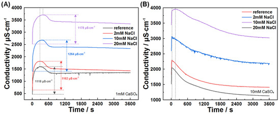 NaCl concentration effect on the conductivity evolution of C3A–quartz suspension when hydrating in solutions with (A) 1 mmol·L−1 CaSO4 or (B) 10 mmol·L−1 CaSO4.