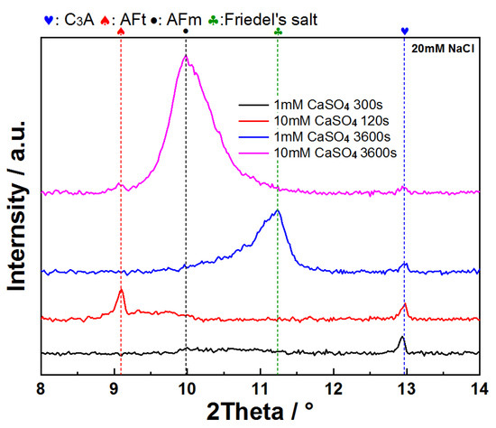 When C3A is dissolved in mixed sulfate–chloride solutions, the antagonistic effects of these ions on dissolution kinetics are superseded by sulfate dominance, as evidenced by suspension conductivity measurements (Figure 14). The conductivity profiles of C3A–quartz mixtures in CaSO4–NaCl mixtures consistently mirror those in pure CaSO4 solutions. Notably, the pre-inflection conductivity increment rises from 1118 μS·cm−1 in reference solutions to higher values with NaCl addition, indicating partial counteraction of sulfate’s inhibitory effect that enhances ionic accumulation. XRD analysis (Figure 15) reveals C3A’s preferential formation of sulfur-containing hydration products. Only at low sulfate concentrations does Friedel’s salt emerge and evolve into the dominant phase.