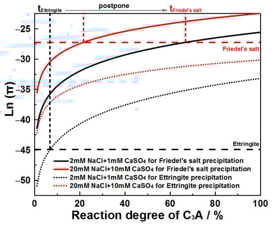Ion activity products for Friedel’s salt and AFt were plotted against C3A’s reaction extent across systems, as presented in Figure 16. Analysis reveals that in CaSO4–NaCl mixed solutions, the reaction extent required to reach AFt saturation consistently registers as the lowest value when compared to Friedel’s salt. This thermodynamic priority confirms C3A’s preferential formation of AFt.