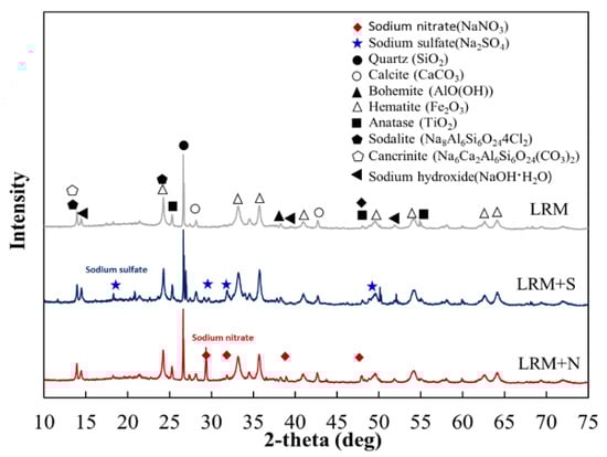 The mineral composition of the LRM neutralized by nitric acid and sulfuric acid was analyzed. The results shown in Figure 2 indicate that the primary compounds of LRM were found to be quartz, calcite, bohemite, and hematite []. These compounds were also found in LRM+S and LRM+N. For LRM+S, the characteristic peaks were observed at 2θ = 18.1, 29.6, 31.9, and 49.5°, corresponding to Na2SO4, due to the addition of sulfuric acid. In the case of LRM+N, the characteristic peaks were identified at 2θ = 29.4, 31.8, 38.9, and 47.9°, corresponding to NaNO3, due to the addition of nitric acid.