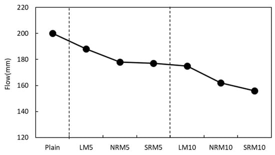 The flow of cement mortar that contained LRM was compared with that of Plain, as shown in Figure 3. The flow of LM was lower than that of Plain. As the content of LRM increased, the flow value decreased. In particular, the flow of NRM and SRM, which are samples that used LRM after modification, was lower than that of the LM samples; this is likely because the viscosity of the LRM neutralized by nitric acid and sulfuric acid increased.
