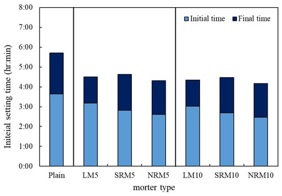 The setting time of cement mortar containing LRM was compared with that of Plain, as shown in Figure 4. The initial and final setting times of LM were shorter than those of Plain. For LM5 and LM10, the initial setting times were reduced by 28 and 37 min, and their final setting times were reduced by 73 and 82 min, respectively, compared to Plain; this indicates that using LRM had a greater impact on the final setting time than the initial setting time due to the NaOH component effect [].