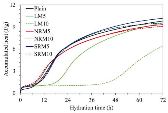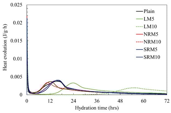 - NRM and SRM, with the addition of LRM+N and LRM+S, had a shorter initial setting time and a similar final time compared to LM. The hydration heat peak of NRM and SRM appeared earlier than that of LM and was comparable to Plain.