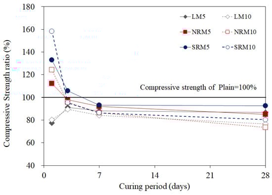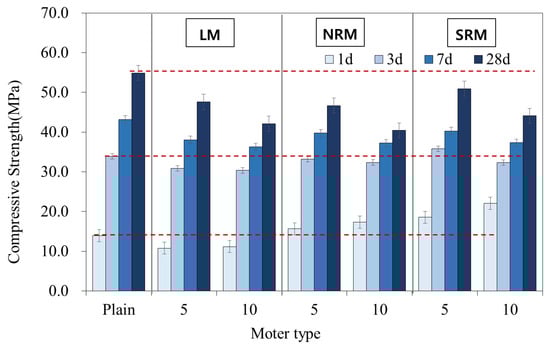 However, the compressive strengths of NRM and SRM were generally higher than that of LM. In particular, the compressive strengths of NRM and SRM at one day of age increased by 112–124% and 133–158% compared to Plain, respectively. The one-day compressive strength of SRM was approximately double that of LM.