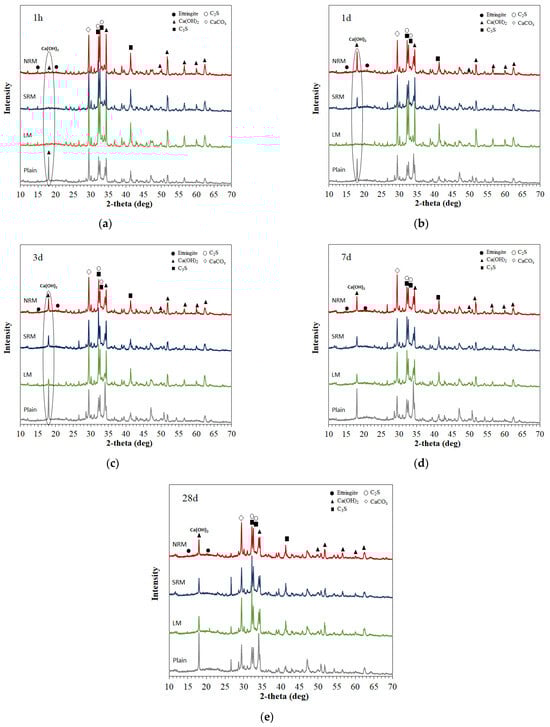 XRD results of Plain, LM10, NRM10, and SRM10 mortars after (a) 1 h and (b) 1 day. (c) 3 days (d) 7 days (e) 28 days.