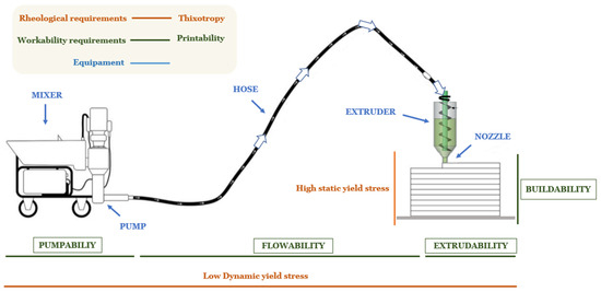 Extrusion-based 3D printing, also known as material extrusion (ME), is currently the most mature and widely adopted technique for additive construction. This method requires the development of highly specialized mortar formulations that meet stringent requirements in the fresh state. These formulations must achieve an optimal balance between flowability—necessary for pumping and extrusion—and buildability, which ensures shape retention and structural integrity post-deposition. The critical rheological parameters governing these behaviors include yield stress, which dictates the ability to support successive layers; plastic viscosity, which controls ease of flow through the nozzle; and thixotropy, which facilitates rapid structural rebuilding after shear cessation [13,14,15,16]. All these parameters within the printing process are illustrated in Figure 1. Additionally, the study considers the phenomenon of pseudothixotropy in cementitious systems, acknowledging that the time-dependent rheological behavior results not only from reversible flocculation and deflocculation of particles but also from the irreversible effects of hydration reactions. This dual contribution is particularly relevant for printable mortars, where structural rebuilding and setting occur simultaneously.