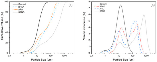 Figure 2. Particle size of raw materials: (a) Cumulative volume (%) and (b) volume distribution (%). - Scanning electron microscopy (SEM): The microstructure of the biomass fly ash was studied using a JEAL SM 840 model (Akishima, Tokyo, Japan) assisted by energy dispersive X-ray spectroscopy (EDS). The sample was carbon-coated using a JEOL JFC 1100 sputter coating.