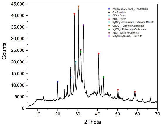 - X-ray diffraction (XRD): The mineralogical characterization of the samples was performed using X-ray diffraction (XRD), a Bruker D2 PHASER diffractometer (Bruker, Billerica, MA, USA), operating with Cu K radiation ( = 1.5406 Å) in –2 configuration. The scan was conducted over a 2 range of 5° to 70°, with a step size of 0.02° and a counting time of 2 s per step; the corresponding diffractogram is presented in Figure 3. Rietveld refinement was used; BFAK consists of approximately 64% amorphous phase. The crystalline phases identified included sylvite (KCl) and potassium carbonate (K2CO3). Quartz (SiO2), muscovite (KAl2(AlSi3O10)(OH)2), and calcium carbonate (CaCO3) were also detected.