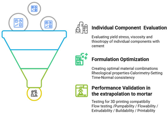 The methodology used in this study follows a systematic and sequential framework designed to evaluate and optimize the rheological behavior of cementitious materials for 3D-printing applications, as shown in Figure 4. Each stage builds upon the outcomes of the previous one, ensuring a coherent and progressive approach to material development.