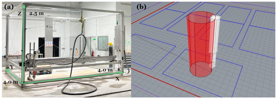 Experimental setup for 3D printing of calibration cylinders: (a) Large-scale 3D printer at Cementos La Cruz, and (b) digital model of the calibration cylinder.