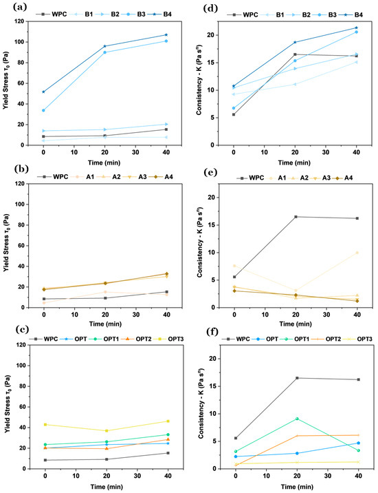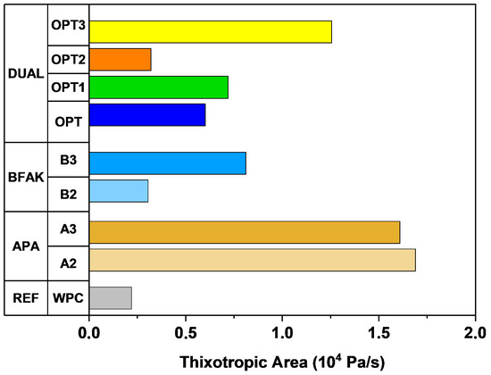 In formulations with both additives (Figure 7c,f), their roles seem complementary. APA reduces the viscosity of the mixture compared to the reference (WPC) because of its plasticizing action. At the same time, it increases the yield stress, enhancing structural recovery and stability. BFAK promotes cohesion and increases viscosity, with a steady growth in the yield stress and consistency as its dosage increases. Among the formulations prepared with both additives, OPT3 exhibits the most pronounced increase in the yield stress, reflecting the synergistic effect of APA and BFAK. This formulation also shows a noticeable decrease in consistency compared to other combinations, balancing flow resistance and structural build-up.
