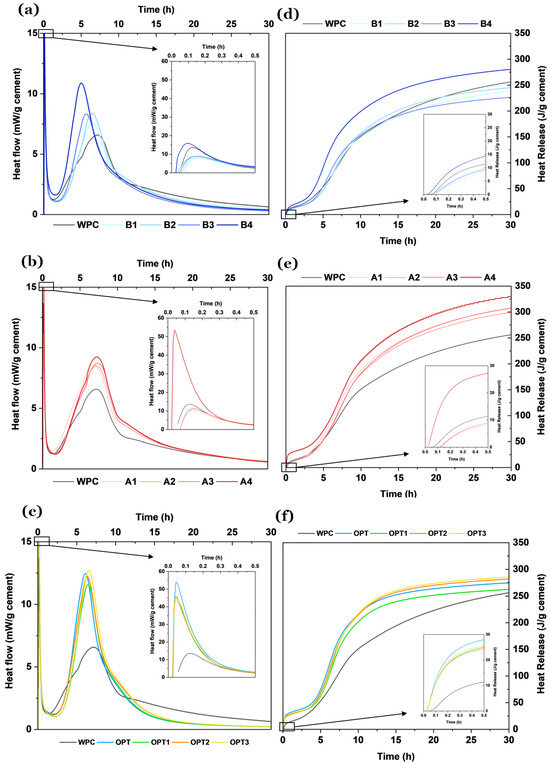 When APA is combined with BFAK in ternary mixtures (OPT-series), the magnitude of the main hydration peak increases substantially compared to the WPC reference (Figure 10c,f), reinforcing the synergistic stimulation of the hydration process. This enhancement aligns with prior findings: APA improves ion transport and nucleation, while BFAK contributes potassium ions that promote early C–S–H development. However, a deviation is noted in the temporal evolution of the heat release. Despite the heightened peak intensities, the main hydration peaks in OPT-series pastes appear later than in WPC. This shift indicates a prolonged acceleration induction period. The extension of the induction period suggests that the high K2O content from BFAK may counteract APA’s accelerating action by temporarily stabilizing a passivating layer or altering pore solution saturation. These effects delay the breakdown of protective films around clinker grains, thus postponing the onset of rapid hydration, which is consistent with the delayed setting times observed in Table 4.