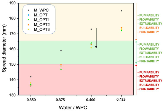 Within this framework, the optimal mini-slump range was fixed for 3D-printable mortars as between 150 and 170 mm. Mortars within this range achieve a critical balance between extrudability and buildability: the mixtures are sufficiently fluid to allow continuous flow through the nozzle yet cohesive enough to retain their form once deposited. Based on these findings, a water/WPC ratio of 0.40 was selected for the calibration cylinder tests, as it reliably produced mixtures within the optimal mini-slump window. It may be important to emphasize the relevance of controlling the preparation of the formulations, given that variations as small as 0.025, i.e., 2.5% in the water content, result in significant changes in the consistency of the mixtures. This zone, referred to as the “green zone,” satisfies the essential criteria for successful 3D printing: pumpability, flowability, extrudability, buildability, and printability. By contrast, the “orange zone” encompasses suboptimal conditions, in which deposition is possible but layer stacking is limited due to poor structural integrity. The “red zone” represents insufficient workability, where material flow is constrained, rendering the mixture unprintable, as shown in Figure 11. At a water/WPC ratio of 0.40, all optimized mixtures demonstrated stable extrusion and acceptable buildability.