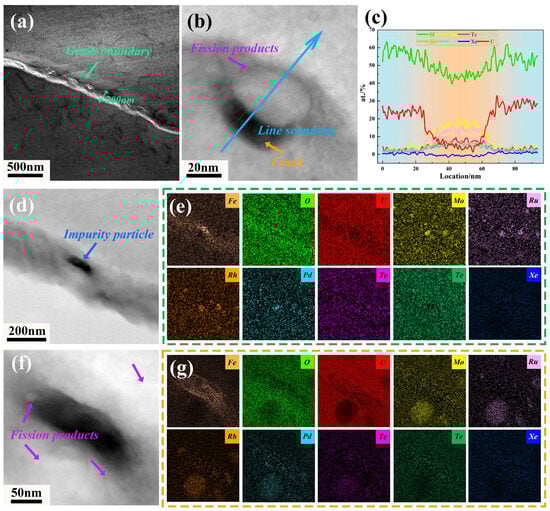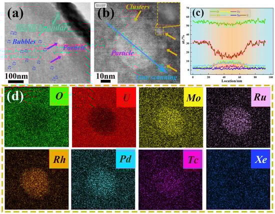 - In the grain boundary region, solid fission products, including Mo, Ru, Rh, and Pd, are enriched in spherical particles and tend to form high-density segregation around impurity particles, leading to localized stress concentration and grain boundary embrittlement.