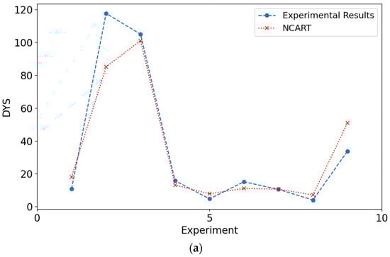 Performance of the models in predicting DYS values in the test phase: (a) Experimental results and NCART, (b) experimental results and RF, (c) experimental results and CNN.