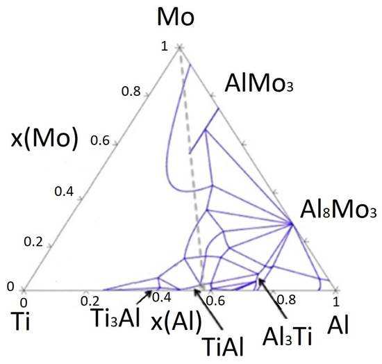 The Ti–Al–Mo ternary system has attracted considerable attention due to its critical role in the development of advanced titanium aluminide–based alloys. These alloys are renowned for their exceptional high–temperature strength, low density, good oxidation resistance, and potential for use in structural applications across the aerospace and automotive industries. However, limitations such as poor room–temperature ductility have driven the need for alloying strategies that can enhance mechanical performance [20,21,22,23,24].