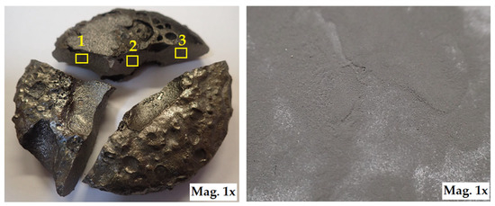 Ti55Al27Mo13 alloy after aluminothermic melting, and nanopowder after crushing and milling, areas 1, 2, 3 indicate sampling locations for SEM micrographs.