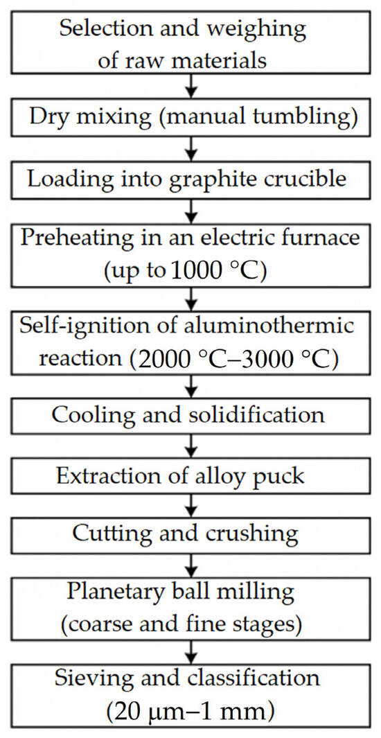 To improve the clarity of the experimental procedure, we have added a schematic illustration (Figure 4) that summarises the whole manufacturing process of the Ti55Al27Mo13 alloy—from the selection of raw materials through aluminothermic reduction, post–processing, and powder preparation. This visual representation will help readers understand the step–by–step workflow of the synthesis route.