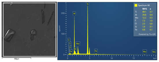 The results of the Ti55Al27Mo13 chemical composition analysis are shown in Table 2. We performed the measurement using X–ray fluorescence (XRF). The method and device we used do not allow for measuring carbon content. Three measurements were performed. An EDS analysis was performed using a scanning electron microscope to determine the carbon content. It can be stated, from the Table 2 results, that the alloy Ti55Al27Mo13 contains the basic elements characteristic for this alloy type, namely Ti 54.86 ± 0.41 wt.%, Al 27.34 ± 0.53 wt.%, and Mo 13.62 ± 0.20 wt.%. From a chemical composition point of view, it can be stated that it is a titanium–aluminium–molybdenum alloy of a specific composition with accompanying elements (Si, Fe, Mn, Cu; see Table 2). We used three different analytical techniques to characterise the chemical composition of the Ti55Al27Mo13 alloy, each providing complementary information. X–ray fluorescence spectroscopy (XRF) determined the average bulk composition of the alloy, with a focus on heavier elements (Table 1). Energy–dispersive spectroscopy (EDS) was subsequently used in two modes: area analysis and local phase–specific analysis (Table 2). At the same time, XRF does not detect light elements such as carbon and oxygen; EDS analysis, on the other hand, allows for the detection of these elements, which are essential for evaluating the presence of carbides and oxides. It is worth noting that the number of identified elements varies depending on the analysed region and microstructural features. Therefore, the data from Table 2 and Table 3 are interpreted in the context of the method used and the measurement focus (bulk vs. local composition).
